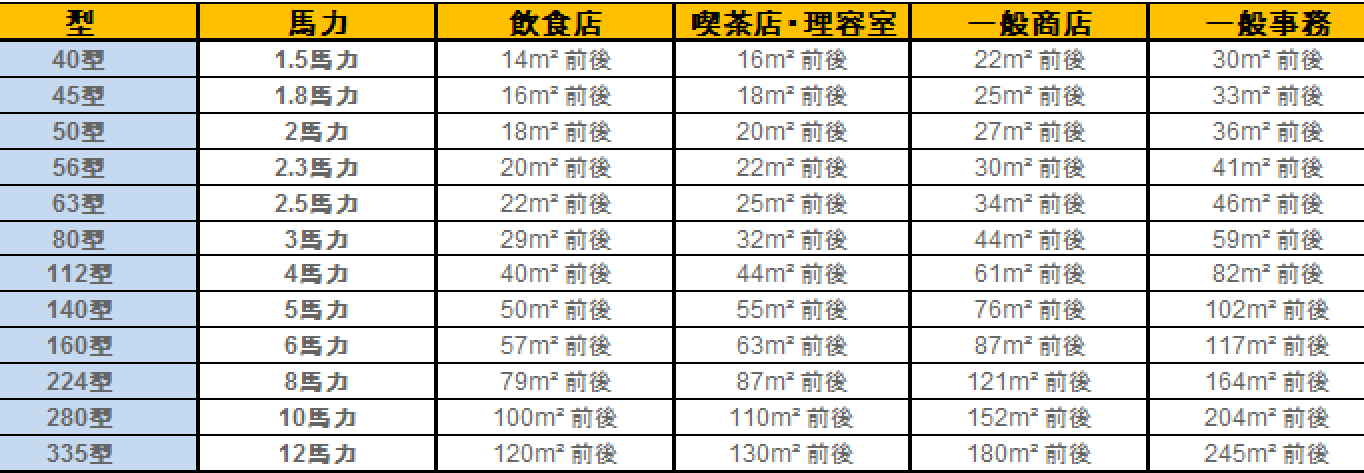 こちらはあくまで目安となり、機械熱、日当たり、風の流れにより大きな馬力が必要なことがあります。